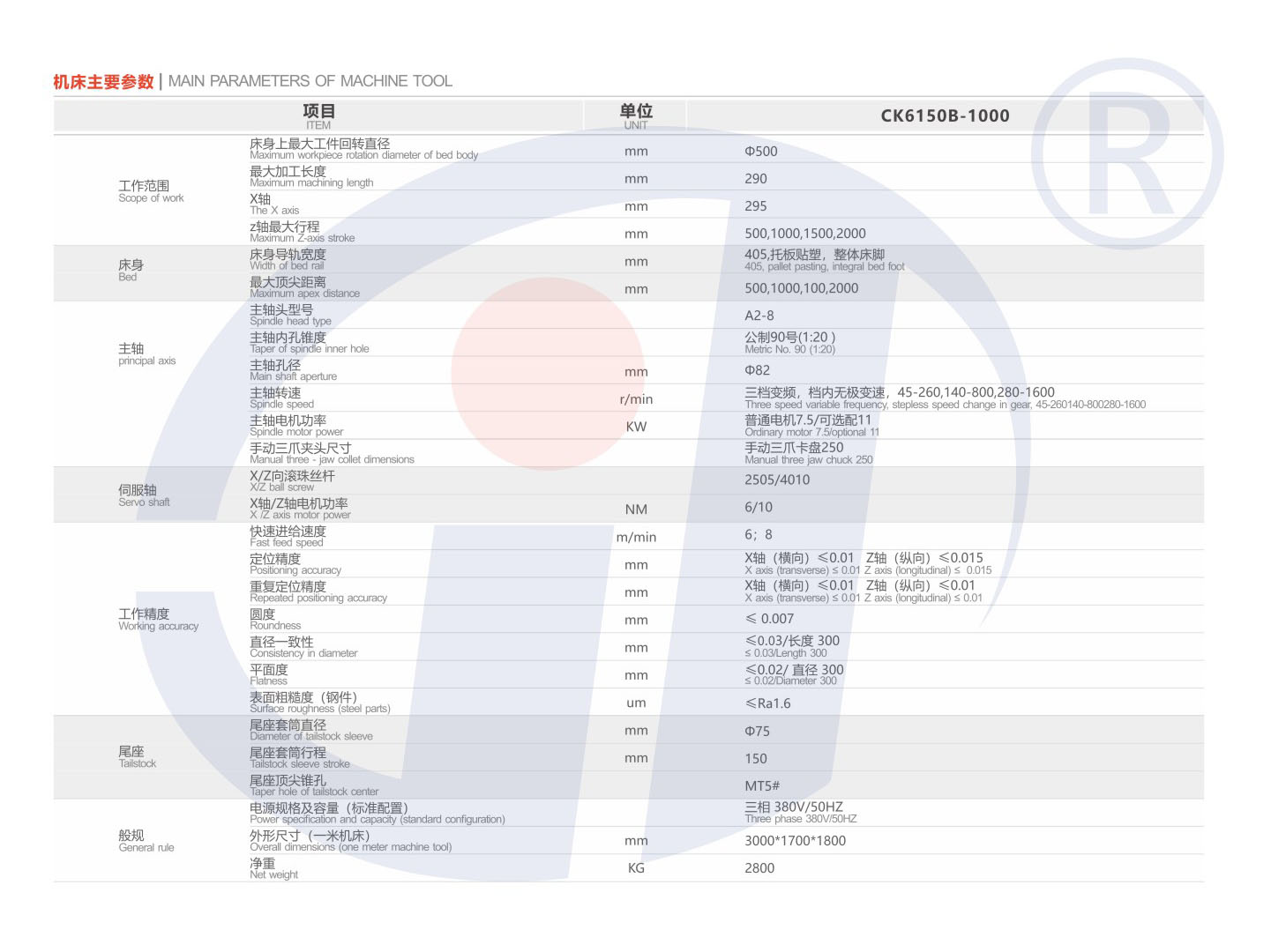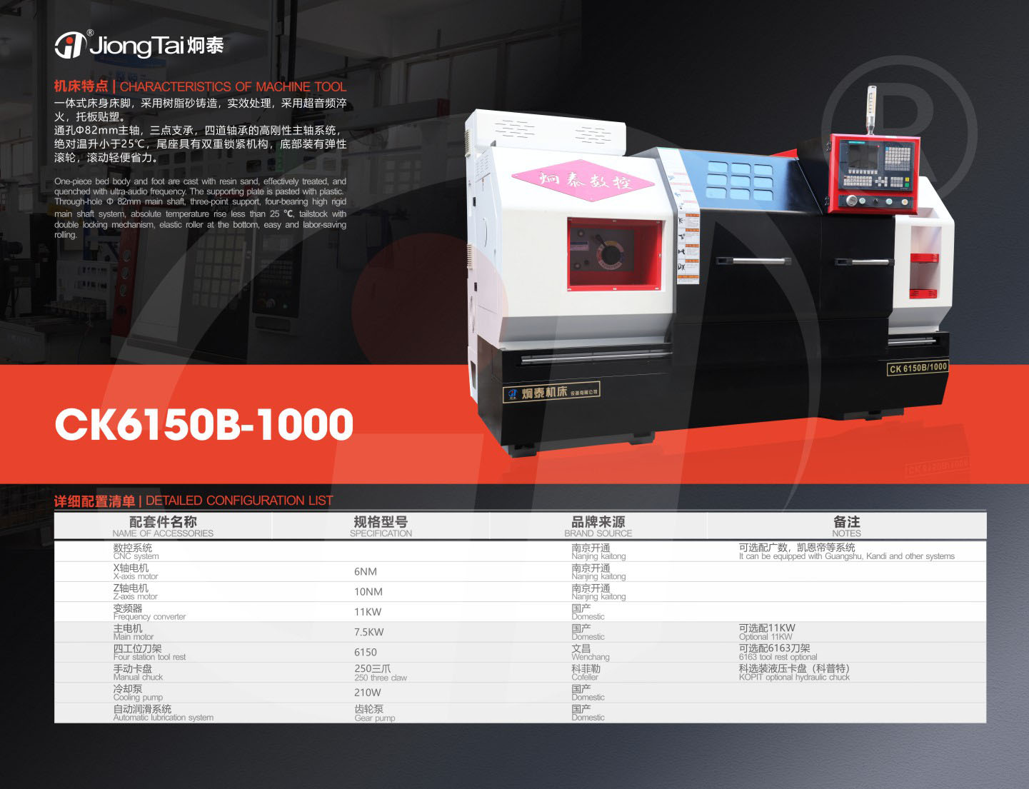 机床特点 一体式床身床脚,,,,,接纳树脂砂铸造,,,,,实效处置惩罚,,,,,接纳超音频淬火,,,,,托板贴塑。。。。。 通孔中82mm主轴,,,,,三点支承,,,,,四道轴承的高刚性主轴系统,,,,,绝对温升小于25°C,,,,,尾座具有双重锁紧机构,,,,,底部装有弹性滚轮,,,,,转动轻使省力。。。。。