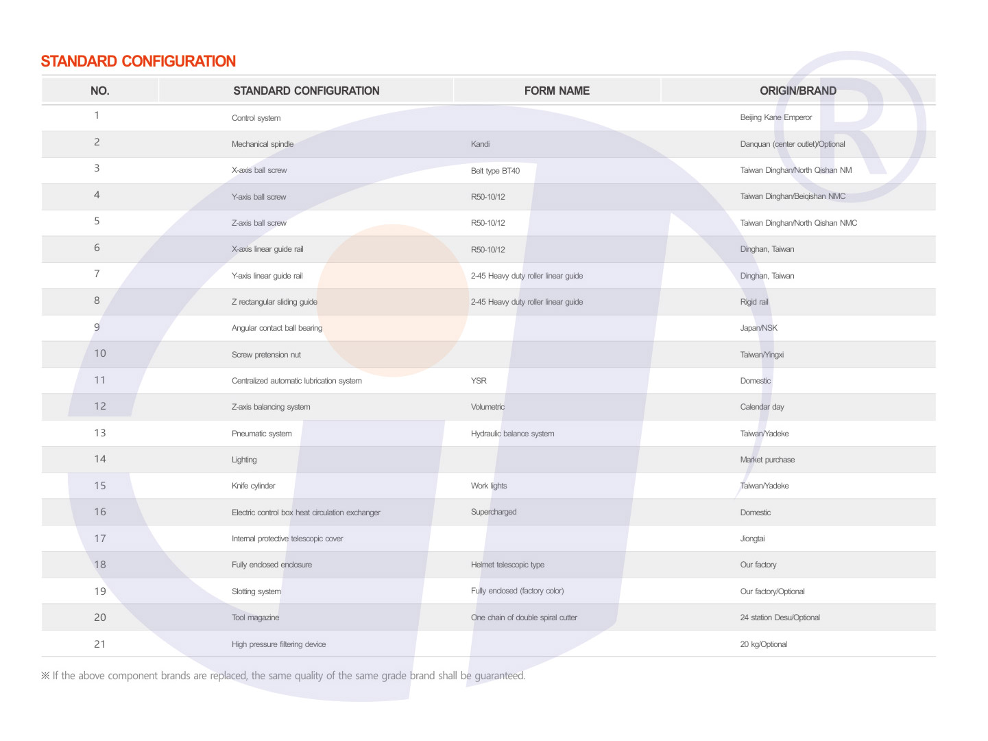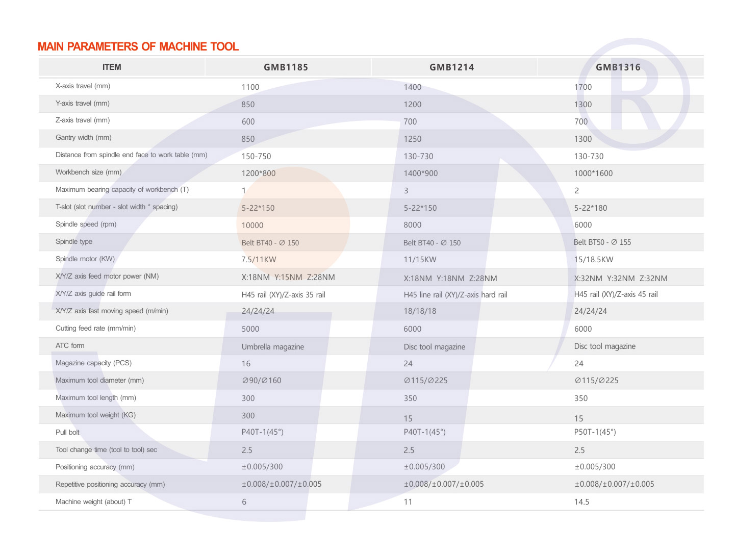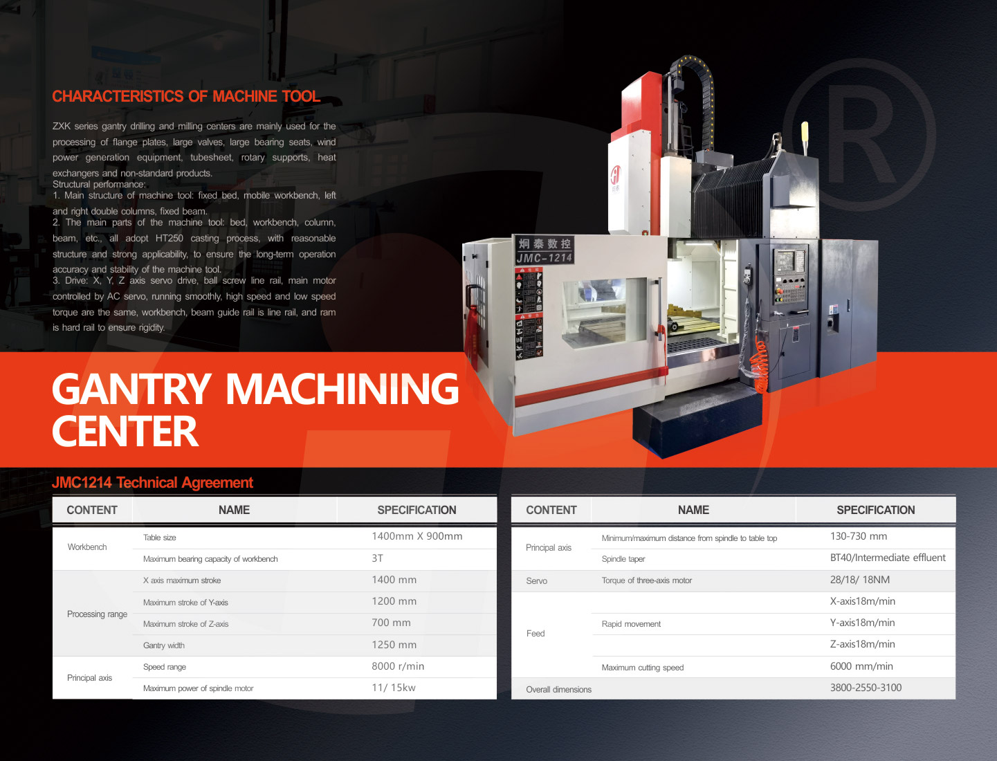 3, transmission: X, Y, Z axis servo drive, ball screw line rail, the main motor with AC servo control, smooth operation, high speed and low speed torque, workbench, beam guide rail for line rail, ram using hard rail to ensure rigidity.